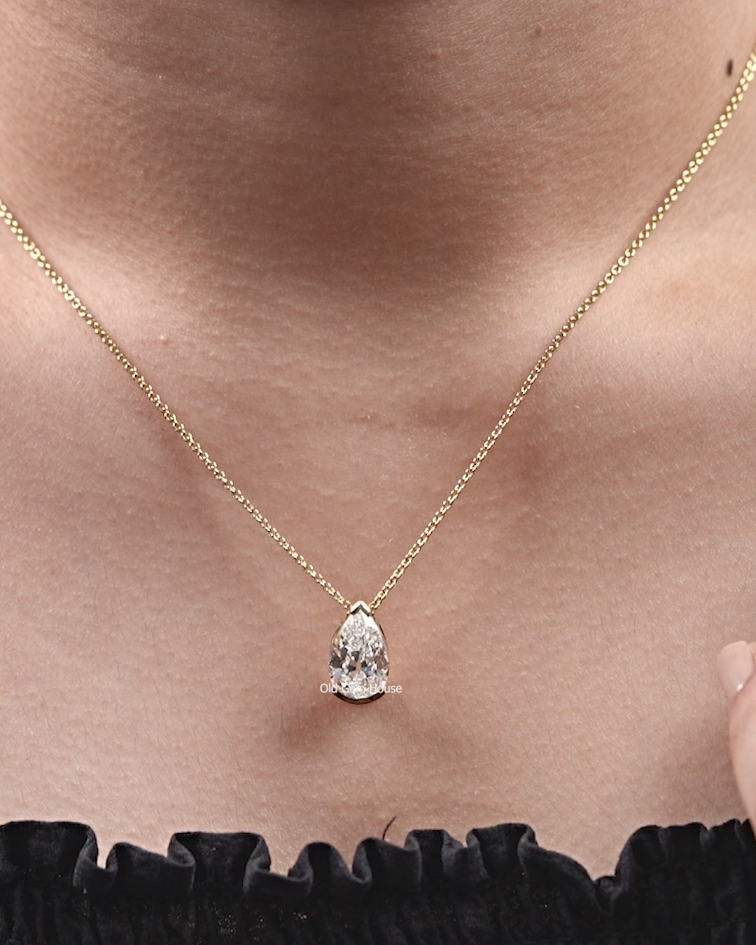 This elegant pendant, crafted by Old Gem House, features a stunning 3.00 carat old mine pear -shaped lab-grown diamond , graded EF color and VS clarity, ensuring remarkable brilliance and fire. Set in a sleek half bezel design, the diamond is perfectly showcased in radiant 14K yellow gold , enhancing its natural beauty. The sophisticated 16-inch chain completes the piece, offering a perfect balance of modern elegance and vintage charm. Ideal for any occasion, this pendant is a true statement of enduring style and ethical luxury.